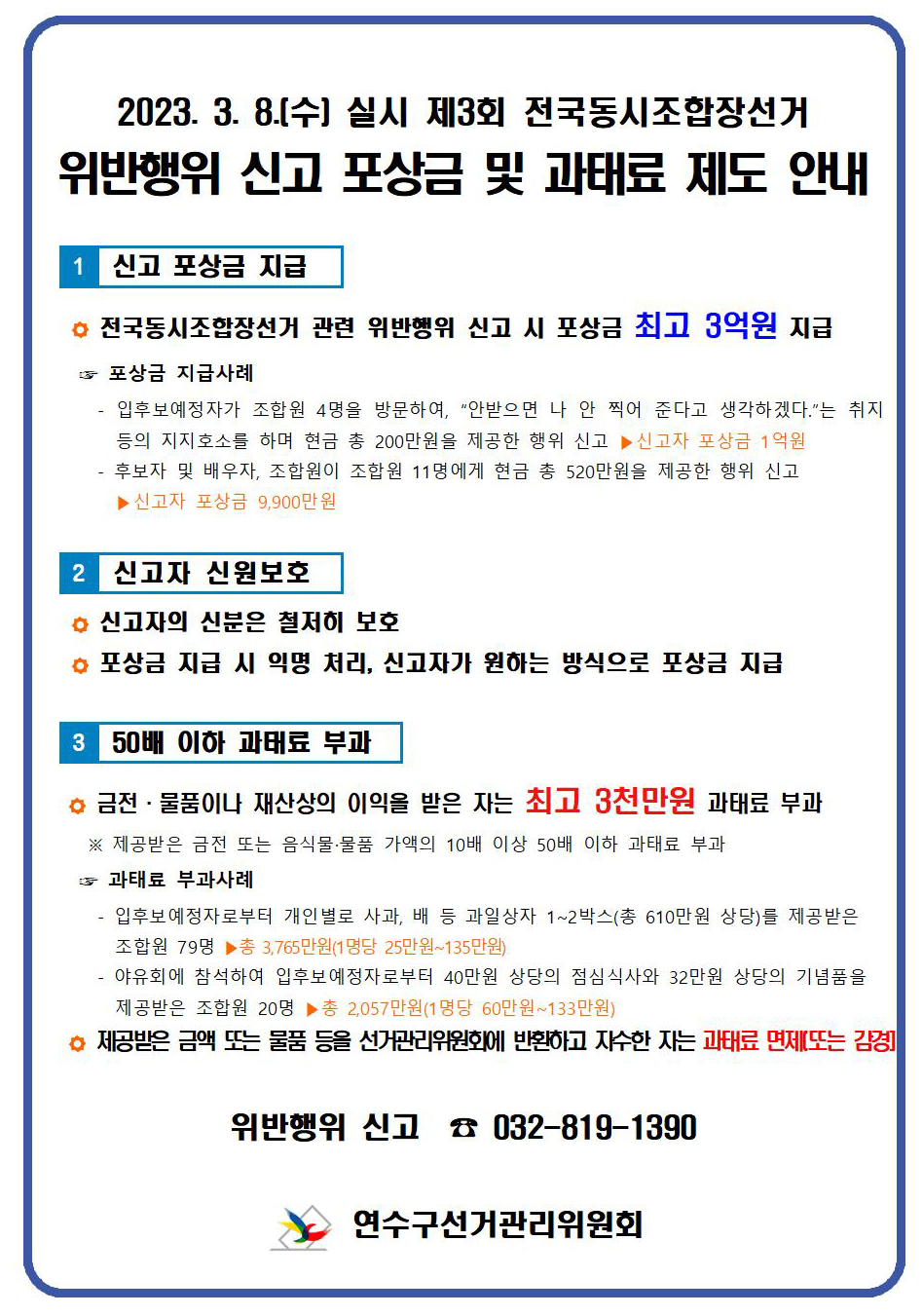 Á¦3ȸ Àü±¹µ¿½ÃÁ¶ÇÕÀå¼±°Å À§¹ÝÇàÀ§ ½Å°í Æ÷»ó±Ý ¹× °úÅ·á Á¦µµ ¾È³»