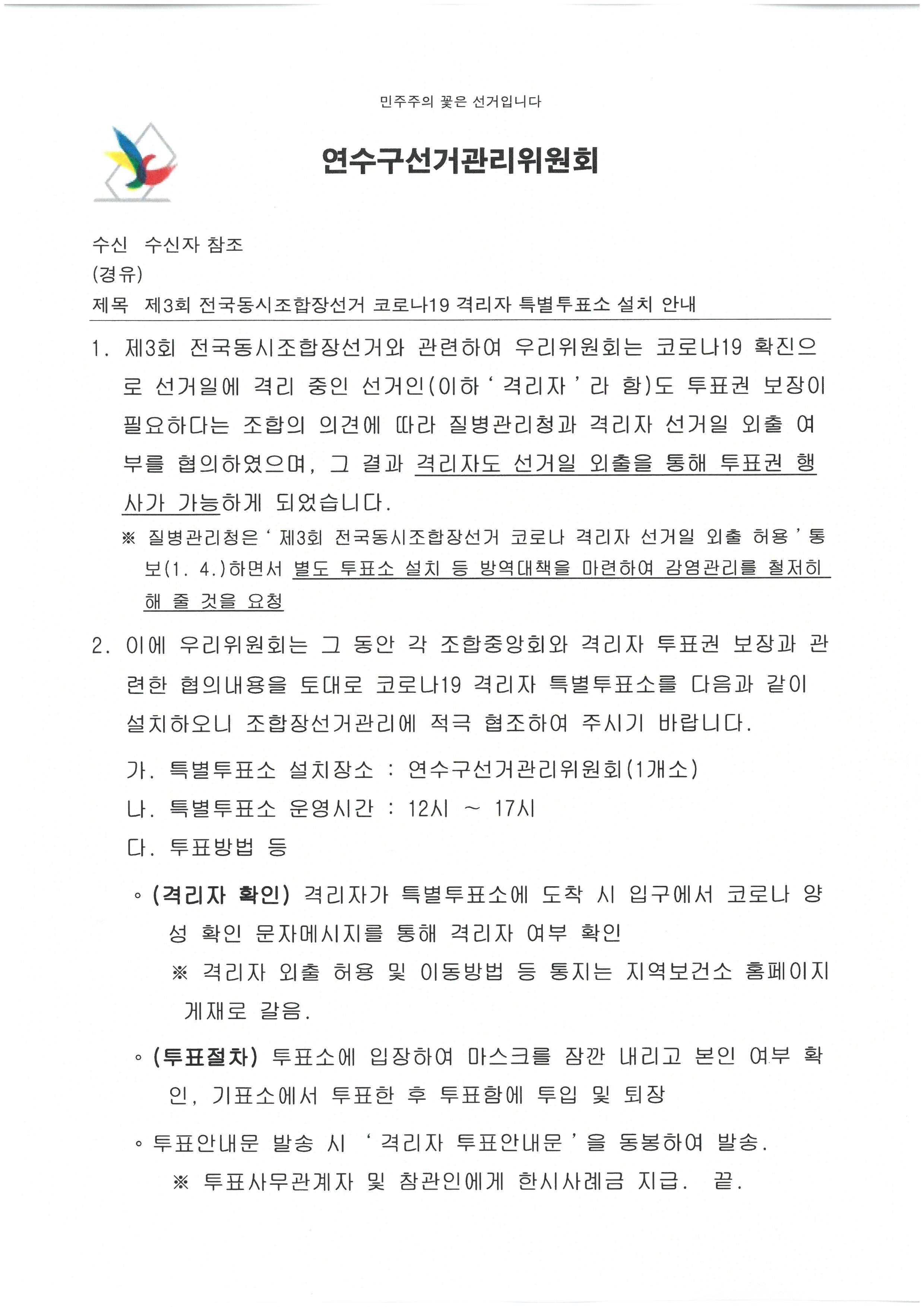 Á¦3ȸ Àü±¹µ¿½ÃÁ¶ÇÕÀå¼±°Å Äڷγª19 °Ý¸®ÀÚ Æ¯º°ÅõÇ¥¼Ò ¼³Ä¡ ¾È³»